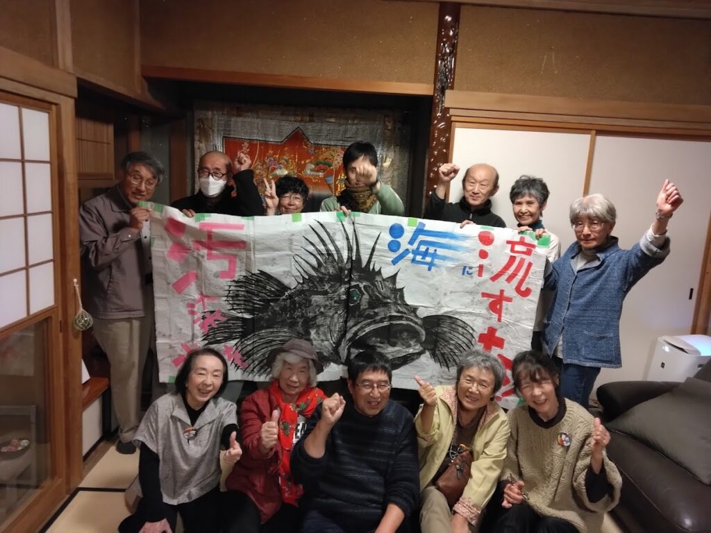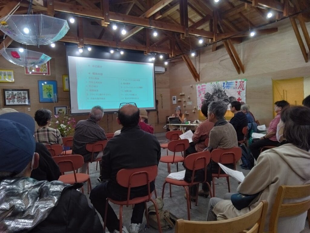 夢生民の横に スイートパスコという皆が集まれる広いスペースが出来 大きなスライドでの上映会などが可能になりました。 福島から 黒田さんが来てくださってそこで 「福島を知ってください」との講演会が開かれました。様々な福島に今起きている問題を、現状を話してくださいました。 2日は 団結小屋 大きな魚のバナーを持ってきてくださいました