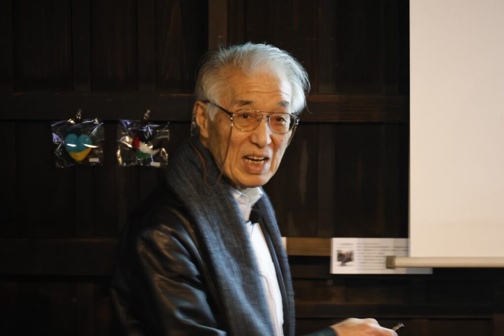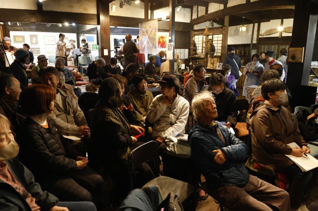 樹々に囲まれた 知る人のみが たどり着ける(?)古民家ギャラリーの場所でしたが       60人限定とした講演会は 椅子がぎっしりと並び、展示会場にも座蒲団が敷かれ、皆が小出先生のお話に聴き入った2時間余りでした。